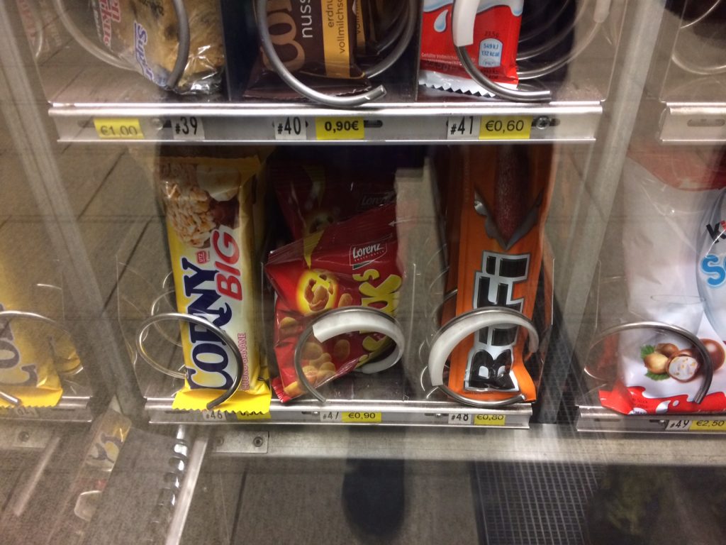 Dans le métro dans les distributeurs il y a même des saucisses, c’est le paquet orange en bas à droite à côté des schokobons 😉